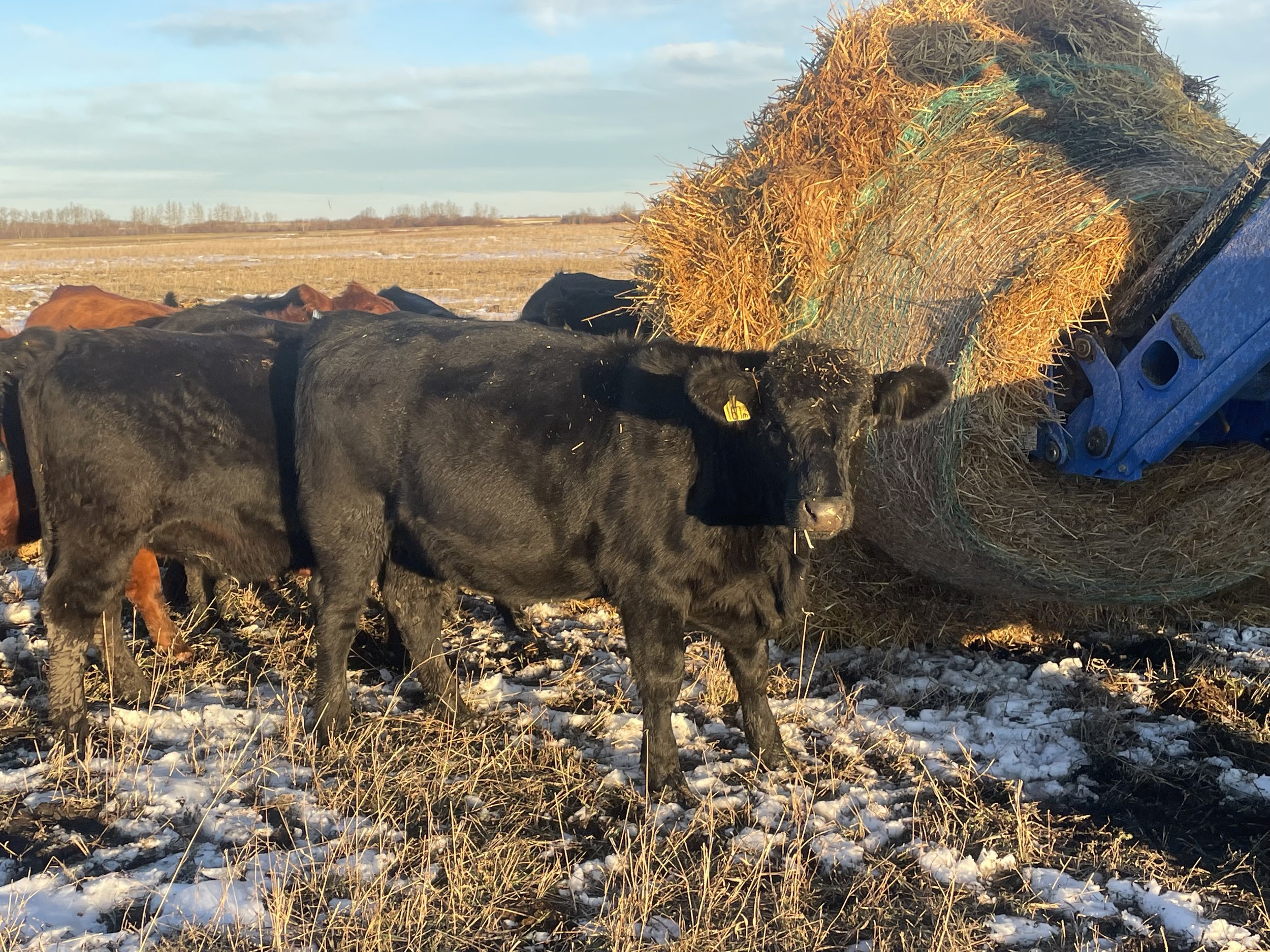 Feeding program: After being weaned, we lightly background all of our calves with good quality hay and work them up to 5lbs of a grain mix of 3lbs of screenings and 2lbs of barley. Last year heifers gained just under 2lbs a day. Late April, these ladies were moved onto stock piled forage & just started receiving hay/green feed supplement 10 days ago. All cattle are in a managed grazing system & moved every 1-3 days. These heifers know how to work for us.